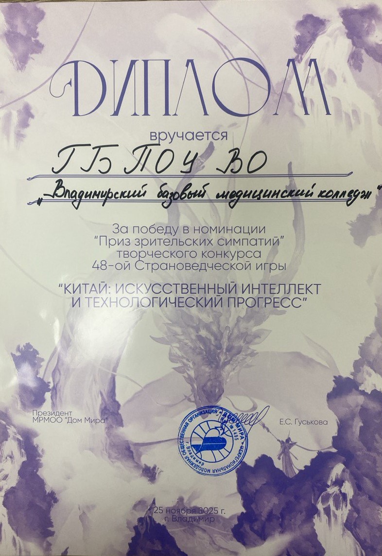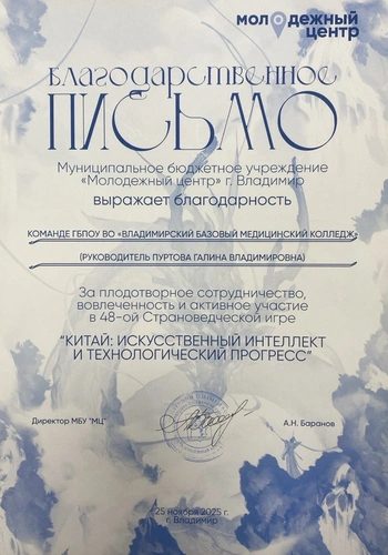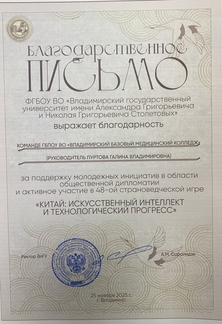 В рамках активизации международного молодёжного межкультурного диалога и реализации молодёжных инициатив в области общественной дипломатии по развитию культуры исторической памяти, 25 ноября 2025 года команда студентов Владимирского базового медицинского колледжа традиционно приняла участие в 48-й страноведческой игре среди общеобразовательных и средних специальных учебных заведений города Владимира и Владимирской области.