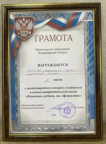 25 февраля 2026 года студенты Владимирского базового медицинского колледжа блестяще представили свою песню «Батальонная разведка» на Международном конкурсе афганской и военно-патриотической песни «Вспомним, ребята, мы Афганистан». Конкурс проходил под руководством Министерства образования Владимирской области совместно с администрацией города Гусь-Хрустального, Гусевским стекольным колледжем и городской организацией «Российский союз ветеранов Афганистана».