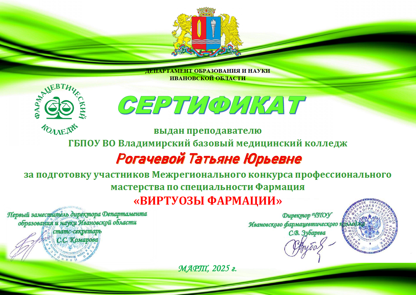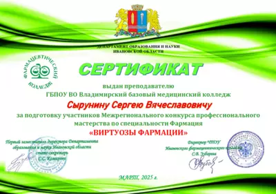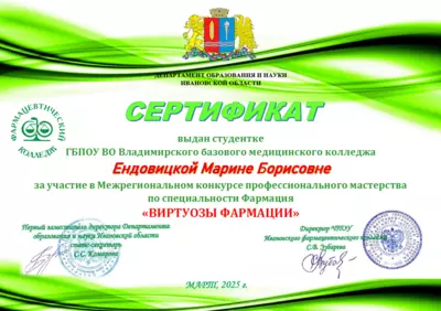 18 марта 2025 года прошел Межрегиональный конкурс профессионального мастерства «Виртуозы фармации» среди обучающихся выпускных групп специальности 33.02.01 "Фармация". Организаторами конкурса выступили Департамент образования и науки Ивановской области и Ивановский фармацевтический колледж. Конкурс представляет собой заочные соревнования на учебной платформе ЧПОУ Ивановского фармацевтического колледжа, в ходе которых участникам предлагается выполнить конкретные задания, позволяющие определить уровень и качество их профессиональной подготовки по всем профессиональным модулям.