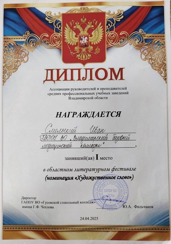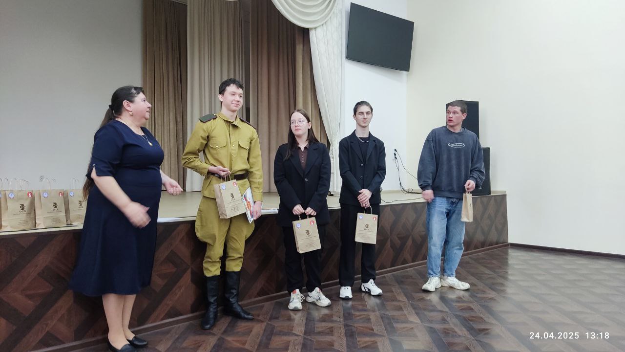 24 апреля 2025 года студенты Владимирского базового медицинского колледжа приняли участие в областном литературном фестивале, посвящённом 80-летию Победы в Великой Отечественной войне, для обучающихся профессиональных образовательных организаций, расположенных на территории Владимирской области. Конкурс состоялся в Гусевском стекольном колледже имени Чехлова. Цель фестиваля заключалась в формировании у студентов профессиональных образовательных организаций потребности в чтении как источнике интеллектуального и творческого развития. Наши студенты Вероника Л. (гр. СД-40/б), Анастасия Ж. (гр. СД-41/б) и Иван С. (гр. СД-41г/д) представили свои работы в номинациях: «Проза без границ» и «Художественное слово». В очень серьёзной борьбе блистательную победу одержал Иван С. в номинации «Художественное слово», безупречно исполнив «Балладу о черственном куске» Н. Лифшица. Поздравляем победителя с заслуженным первым местом! Выражаем искреннюю благодарность за великолепное выступление всем участникам, а также за их подготовку преподавателю и наставнику – Кузнецовой Ирине Вячеславовне. Желаем всем дальнейших творческих успехов и триумфов!
