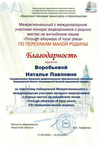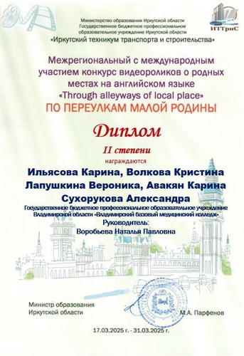 С 17 по 21 марта 2025 года студенты Владимирского базового медицинского колледжа участвовали в Международном конкурсе видеороликов о родных местах на английском языке «Through Alleyways of Local Place» («По переулкам Малой Родины»).