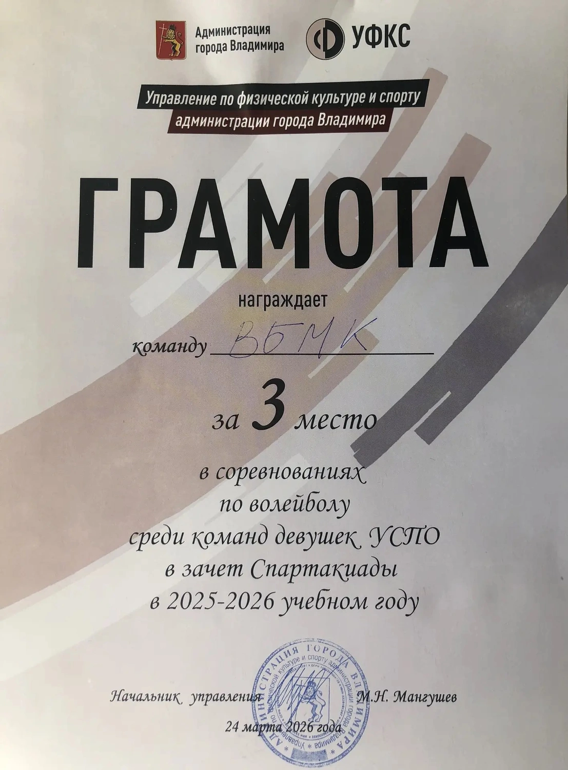 23 марта 2026 года во Владимире прошла городская Спартакиада по волейболу среди команд девушек профессиональных образовательных организаций. И вновь наши девушки проявили характер на волейбольной площадке! Команда Владимирского базового медицинского колледжа стала бронзовым призёром, заняв 3-е место!