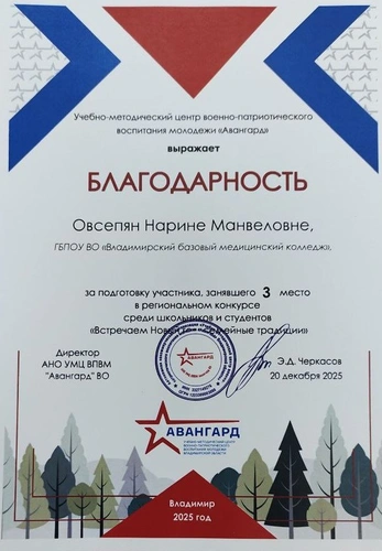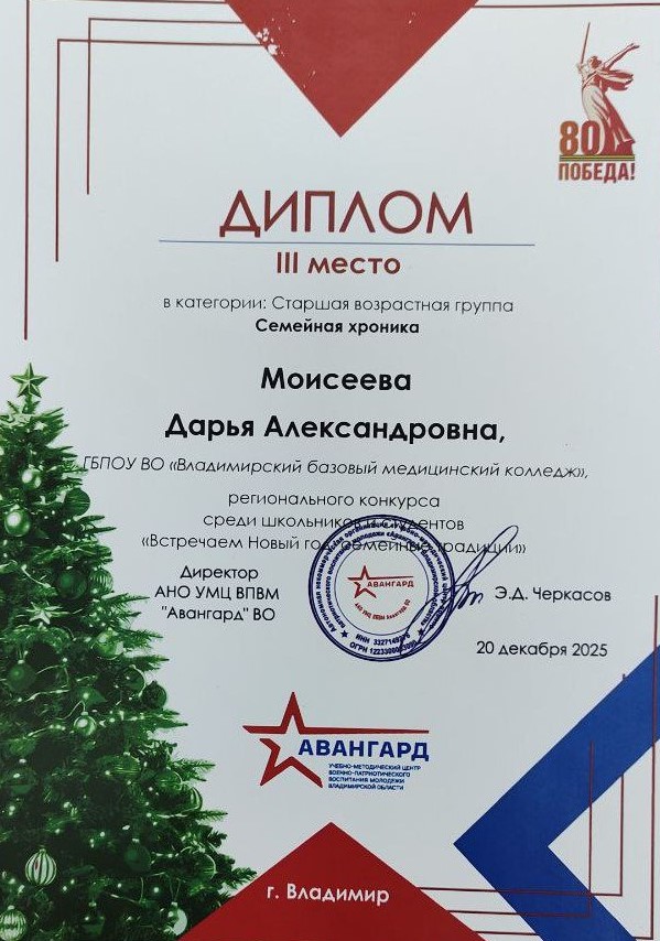 С 15 по 20 декабря 2025 года обучающиеся Владимирского базового медицинского колледжа приняли участие в региональном конкурсе «Встречаем Новый год: семейные традиции». Творческое состязание проводилось среди учащихся общеобразовательных и профессиональных образовательных организаций Владимирской области.