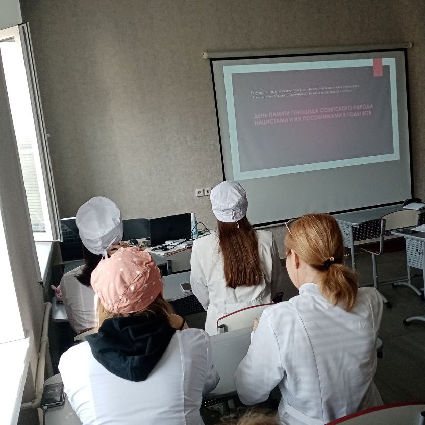 В преддверии Дня единства действий, 18 апреля 2025 года, во Владимирском базовом медицинском колледже состоялся важный исторический экскурс, посвящённый памятной дате - Дню памяти о геноциде советского народа, осуществлённом нацистами и их пособниками в годы Великой Отечественной войны. Мероприятие было направлено на формирование у обучающихся осознания необходимости сохранения исторической правды, памяти и преемственности поколений, на примере истории геноцида мирных советских граждан со стороны нацистов и их пособников в годы Великой Отечественной войны 1941–1945.