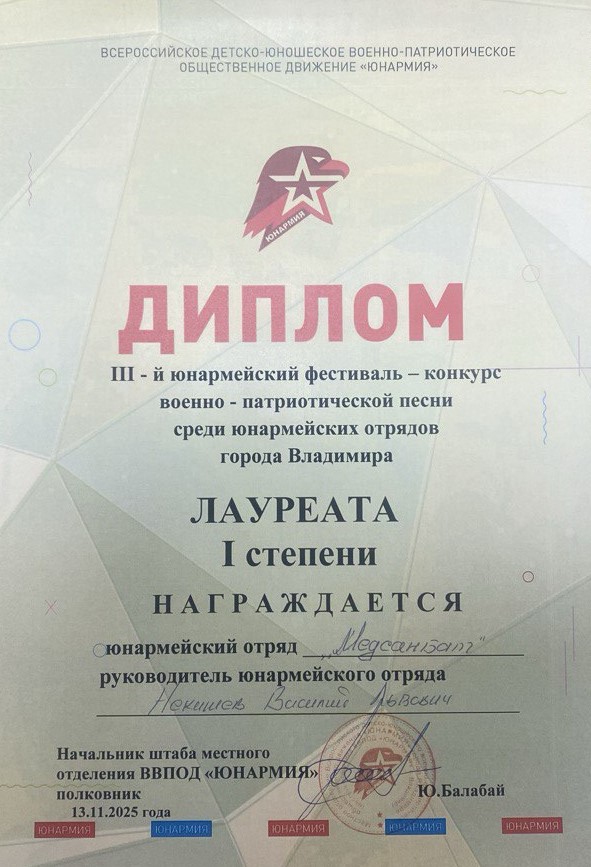 13 ноября 2025 года во Владимирском муниципальном Дворце детского (юношеского) творчества состоялся III юнармейский фестиваль-конкурс военно-патриотической песни, организованный штабом «Юнармии» города Владимира при поддержке управления образования и молодежной политики города Владимира. В фестивале-конкурсе приняло участие 22 юнармейских отряда. Юнармейский отряд Владимирского базового медицинского колледжа «Медсанбат» стал победителем, завоевав первое место. Мы искренне благодарим педагога-организатора Пуртову Галину Владимировну и преподавателя Некишова Василия Львовича, руководителя юнармейского отряда «Медсанбат», за подготовку команды к фестивалю-конкурсу. Поздравляем наших юнармейцев с заслуженной наградой и желаем новых побед!