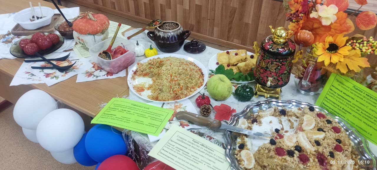 Студенты, принявшие участие в кулинарном соревновании, продемонстрировали креативный подход к созданию изысканных угощений. В этот день на кулинарном батле можно было наблюдать и наслаждаться разнообразными деликатесами: гречневой кашей, пирогами с капустой, узбекским пловом, квашеной капустой, блинами с творогом и многими другими блюдами.