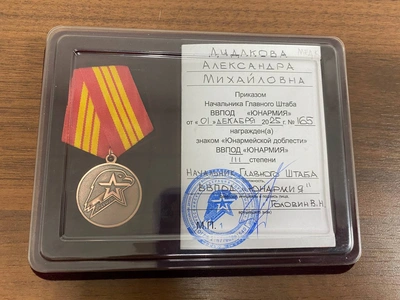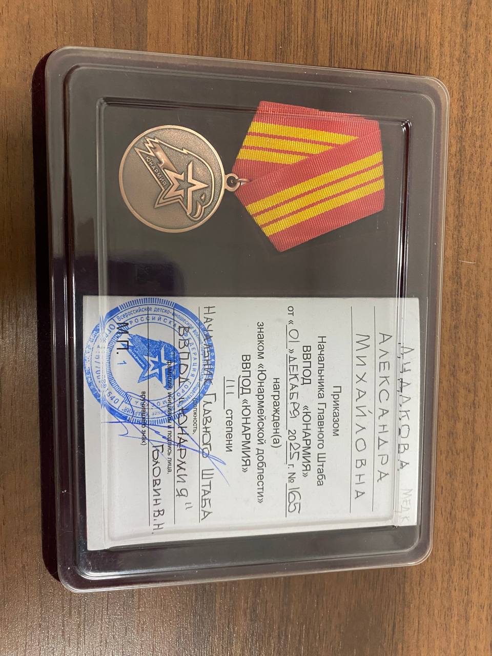 2. Торжественная церемония награждения. Состоялось вручение нагрудных знаков «Юнармейская доблесть» Всероссийского детско-юношеского движения «ЮНАРМИЯ». Высшей награды движения была удостоена студентка нашего колледжа — командир юнармейского отряда Александра Дудакова (группа СД-20/б). Нагрудным знаком отмечают за отличные успехи в учебе, активную общественную деятельность и вклад в развитие патриотического движения.