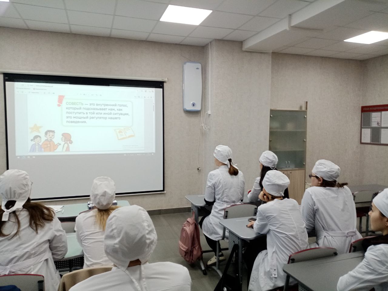В ходе уроков студенты рассмотрели суть совести и её роль как внутреннего ориентира в оценке поступков и формировании личного выбора. Были обсуждены вопросы, связанные с понятием «угрызения совести», а также поступки, не соответствующие моральным принципам и ценностям. Кроме того, участники обсудили, как совесть регулирует личные и общественные отношения.