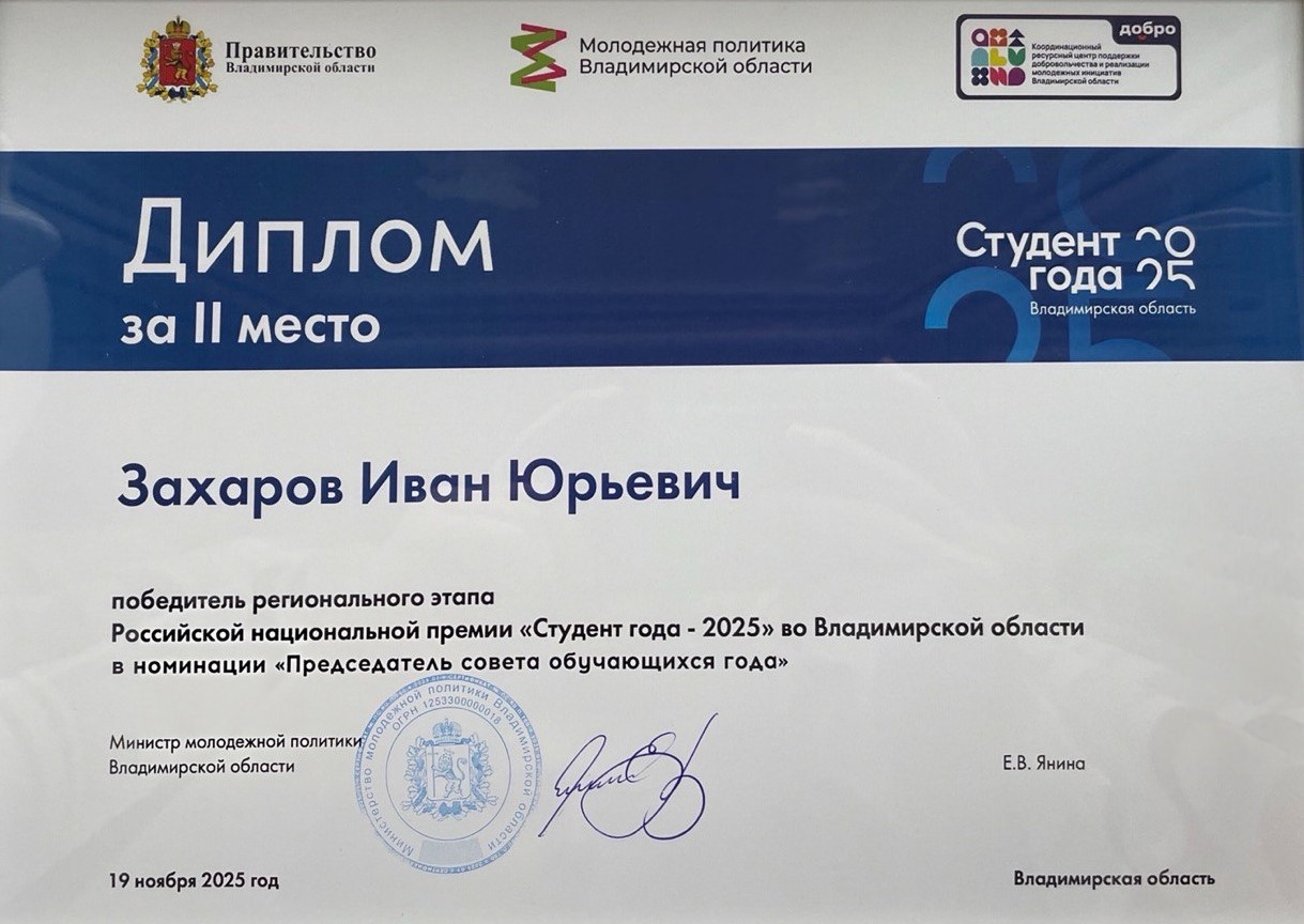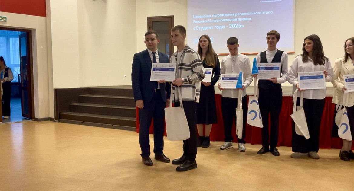 Студенческая жизнь интересна и разнообразна. Быть в центре событий – в этом и есть её смысл. В октябре 2025 года во Владимире прошёл региональный этап Всероссийской премии «Студент года-2025», который объединил 78 самых ярких студенческих талантов из вузов и колледжей Владимирской области. В конкурсе приняли участие и студенты Владимирского базового медицинского колледжа. Конкурсные испытания завершились, и вот 19 ноября 2025 года состоялось награждение победителей и призеров конкурса. Но главное – не только результат, а яркие эмоции от участия, которые делают студенческую жизнь неповторимой. Иван Захаров, студент 4 курса по специальности «Сестринское дело», председатель Студенческого совета Владимирского базового медицинского колледжа, и заместитель координатора регионального отделения ВОД «Волонтёры-медики» во Владимирской области, занял второе место в номинации «Председатель Совета обучающихся года». Поздравляем Ивана с этим достойным призовым местом на региональном уровне и желаем дальнейших успехов в общественной жизни не только колледжа, но и региона в целом.