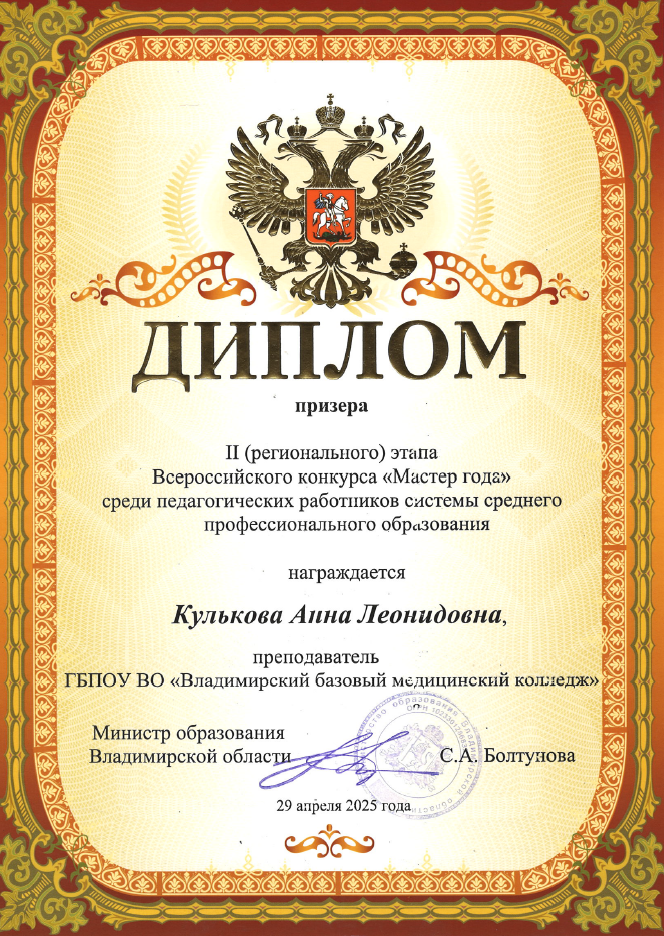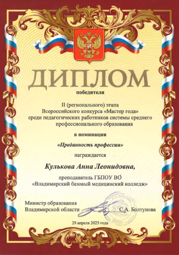 Преподаватель Владимирского базового медицинского колледжа Кулькова Анна Леонидовна стала победителем II (регионального) этап Всероссийского конкурса «Мастер года» в номинации «Преданность профессии» и призером II (регионального) этап Всероссийского конкурса «Мастер года» среди педагогических работников системы среднего профессионального образования.