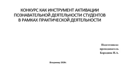 В своём докладе преподаватель отметила, что современные образовательные стандарты ориентированы на формирование профессиональных компетенций студентов, поэтому важную роль начинают играть активные формы обучения. Одним из эффективных инструментов является организация учебных конкурсов, которые повышают вовлечённость обучающихся, стимулируют интерес к дисциплине и способствуют развитию критического мышления.