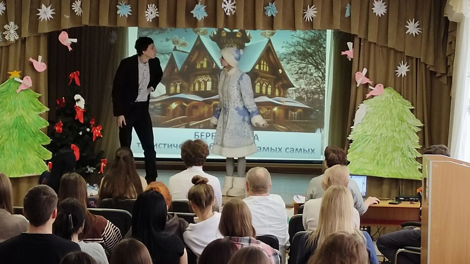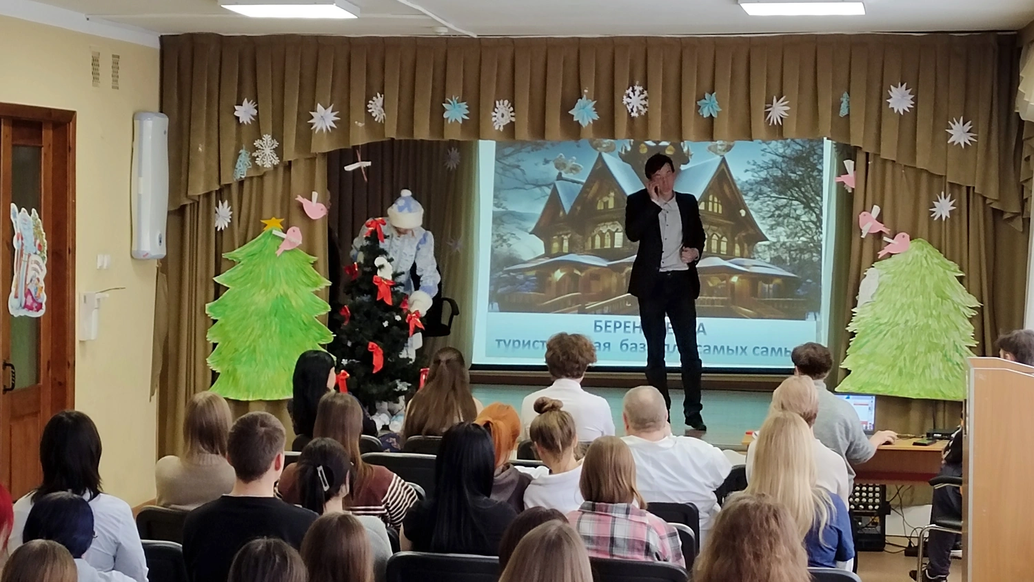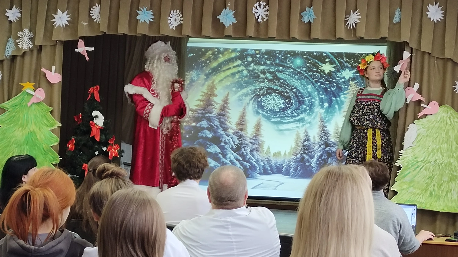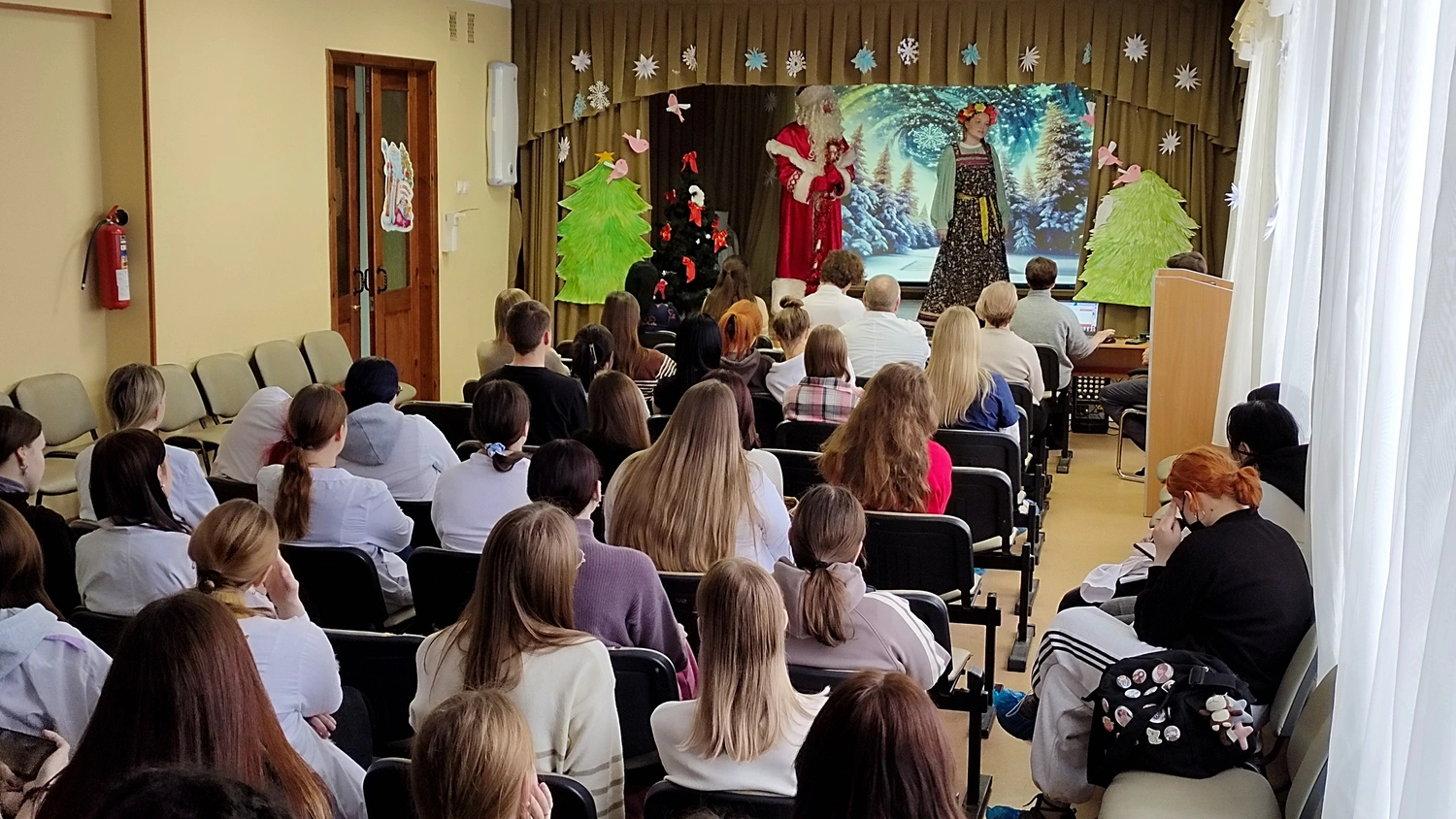 Студентам была представлена театрализованная постановка по мотивам русской народной сказки «Снегурочка», подготовленная участниками театрального кружка под руководством преподавателя Елены Геннадьевны Дроголюбской.